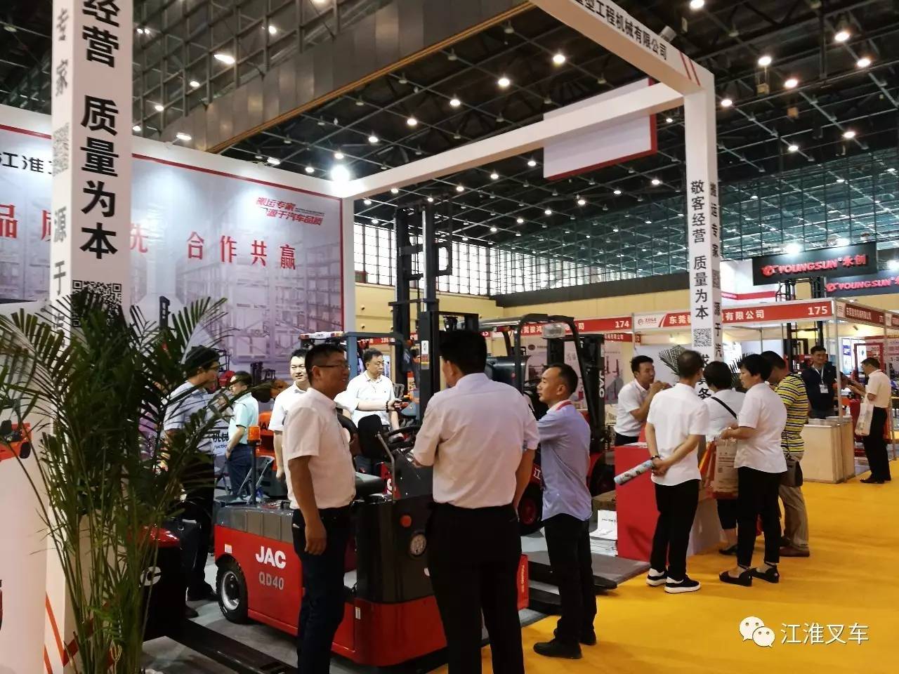 2017年6月2-4日第四届中国郑州国际物流展览会在郑州国际会展中心举行,江淮叉车携旗下CQD15站驾式前移、QD40电动牵引车、J-Ⅱ系列电动平衡重叉车等多款主力车型参展。展会现场江淮叉车展台前参观嘉宾络绎不绝,纷纷咨询、洽谈、订购,很多客户更是亲自上手试乘试驾,现场签单6台,接洽意向客户80余家。随着国家环保政策的日益严苛及用户环保意识的增强,洽谈咨询电动叉车客户明显增多,江淮前移式叉车、电动平衡重叉车、小金刚等电动车型以高性价比、高颜值、优越的操控性能成为现场明星,受到现场客户的高度评价。