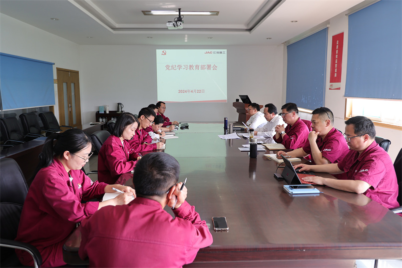 4月22日,江淮重工公司党委召开党的建设领导小组会议暨党纪学习教育部署会,认真学习习近平总书记关于党纪学习教育的重要讲话和重要指示精神,学习贯彻《江汽集团公司党委关于开展党纪学习教育的通知》精神,研究和部署党纪学习教育工作。江淮重工公司党委书记、董事长、总经理,党的建设工作领导小组组长谢振兴出席会议并讲话,江淮重工公司党委班子成员、党的建设工作领导小组成员参加会议。