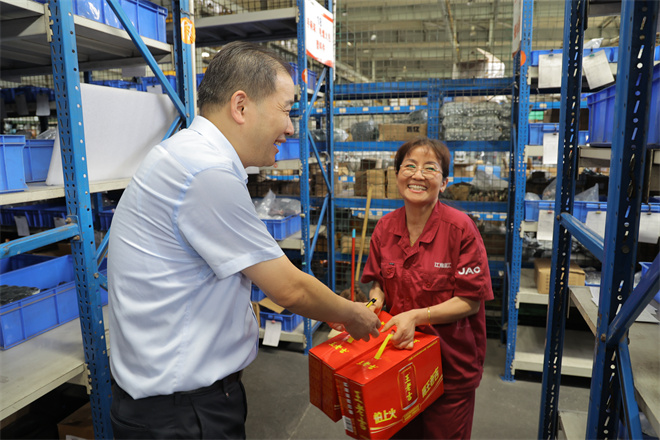 姜文东先后慰问了AGV智行科技生产线、结构厂、总装厂以及物料班、发车组等一线岗位员工,为员工们送上了清凉饮品,并与大家亲切交谈,叮嘱他们在高温天气下要注意身体,防止中暑,如有不适及时休息。